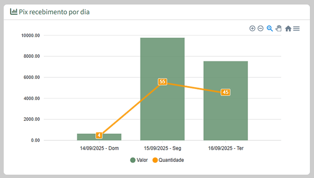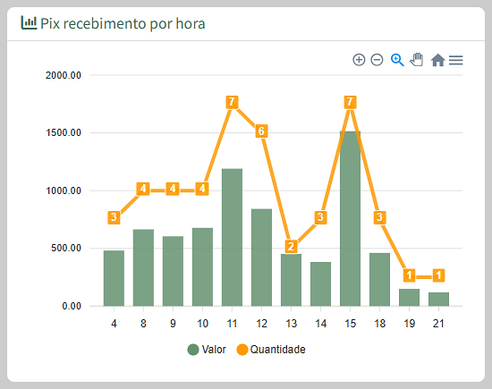 Ao passar o mouse sob as colunas poderá visualizar o valor e quantidade de recebimentos.