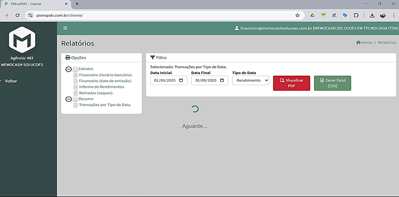 - Relatórios incluem: transações, valores recebidos, taxas aplicadas, estornos, etc.