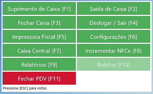 - Suprimento de Caixa[F1]: Adicionar valor ao caixa.