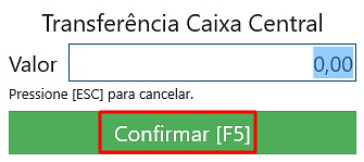 - Caixa Central[F7]: Transferência de valor do caixa direto ao Caixa Central.