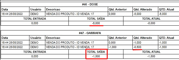 – No relatório é visto a quantidade de doses que foram vendidas e abaixo o quanto foi descontado da garrafa de 1 litro.