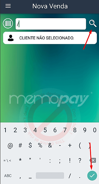 Passo 1 – Após verificar se o produto desejado está cadastrado como fracionável abra o MemoPay no seu dispositivo mobile. Na tela inicial digite / (barra) no campo de pesquisa e clique na lupa para ir para a tela de divisão.