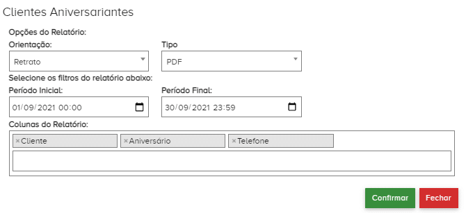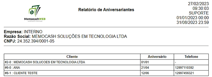 O relatório de Aniversariantes organiza e apresenta os clientes que fizeram aniversário no intervalo de tempo selecionado.