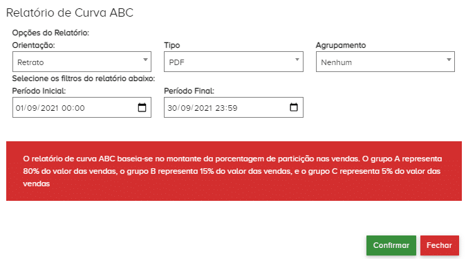 O relatório de Curva ABC estabelece a hierarquia de informações e agrupamento por grau de importância, facilitando a conclusão de dados e a tomada de decisão. A curva é dividida em 3 Regiões (A, B e C) sendo A considerado como 80%, B com 15% e C corresponde a 5%.