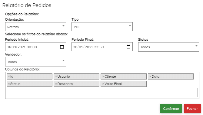 - COLUNAS DO RELATÓRIO – As colunas do relatório estabelecem quais colunas que aparecerão no preenchimento da tabela completa. Por padrão esse relatório vem com as colunas: ID, Usuário, Cliente, Data, Status e Valor.