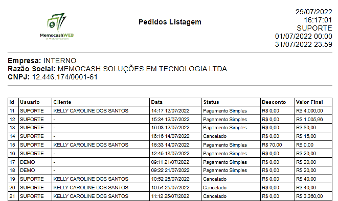 Passo 4 – Basta clicar em “Confirmar” que será gerado um relatório com os pedidos cadastrados no sistema com as informações de Id do Pedido, Usuário, data e hora, Status do Pedido, Valor de Desconto e o Valor Total.