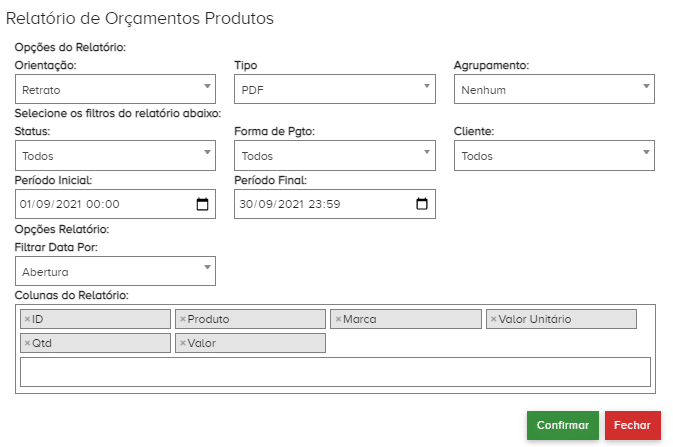 Passo a passo de como gerar um relatório dos produtos dos orçamentos